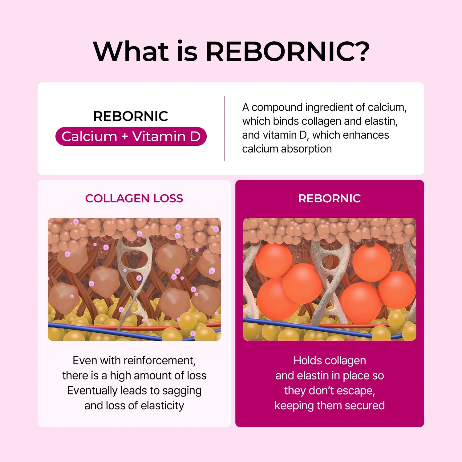 Powered by the unique blend of Calcium and Vitamin D, Rebornic binds collagen and elastin while enhancing calcium absorption. This helps secure skin’s structural proteins, preventing sagging and loss of elasticity, so your skin stays firm, plump, and resilient.